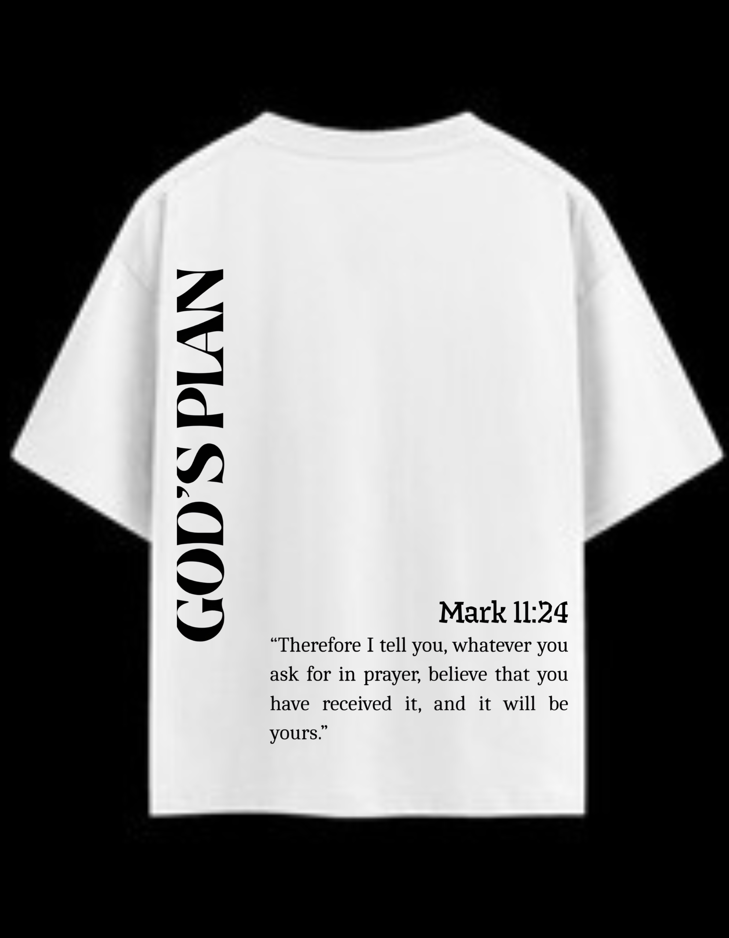 Embrace faith and purpose with the "God's Plan" T-Shirt. This minimalist yet powerful tee is more than just an item of clothing; it's a testament to belief and trust. Featuring the bold text "GOD'S PLAN" running vertically down the side, the design is a quiet declaration of faith. It's complemented by the inspiring words of Mark 11:24: "Therefore I tell you, whatever you ask for in prayer, believe that you have received it, and it will be yours." This powerful verse serves as a constant reminder of the strength of prayer and the promise of divine guidance.